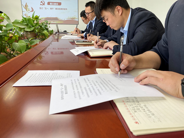 3. 簽訂五一、端午廉潔承諾書。支部書記強(qiáng)調(diào):“五一、端午”假期將陸續(xù)來臨,節(jié)假日期間出行旅游、聚會在所難免,但是一定要記得緊繃廉潔自律這根弦,守住底線,不踩紅線!